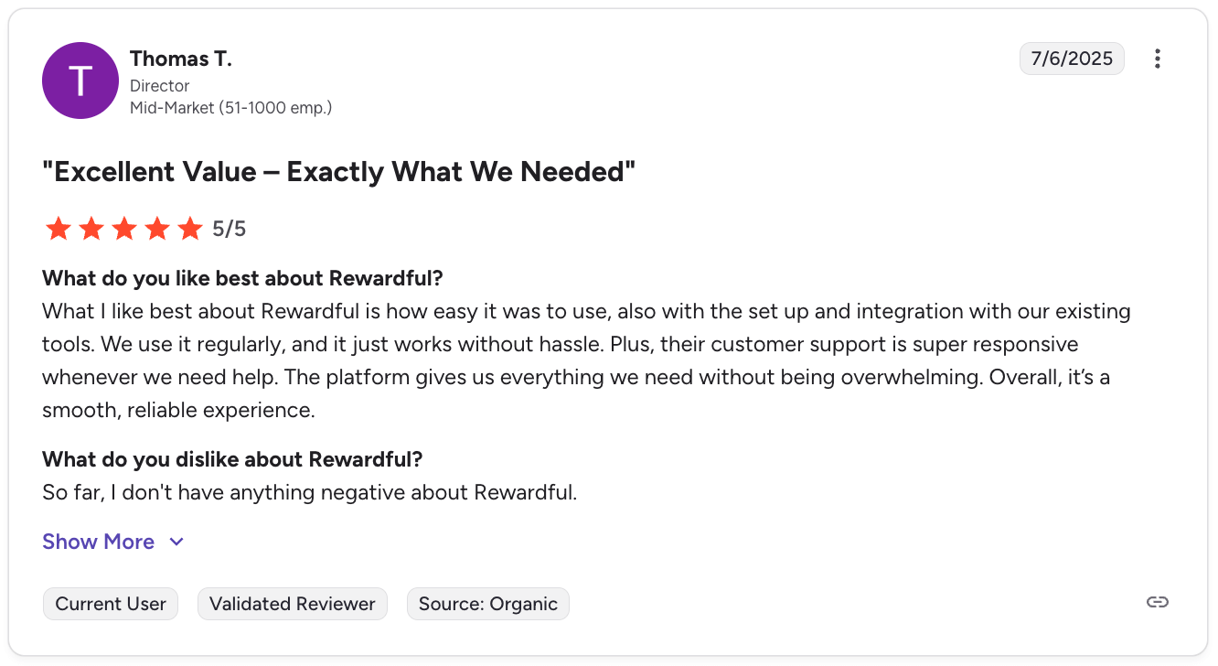 What I like best about Rewardful is how easy it was to use, also with the set up and integration with our existing tools. We use it regularly, and it just works without hassle. Plus, their customer support is super responsive whenever we need help. The platform gives us everything we need without being overwhelming. Overall, it’s a smooth, reliable experience. (Source)